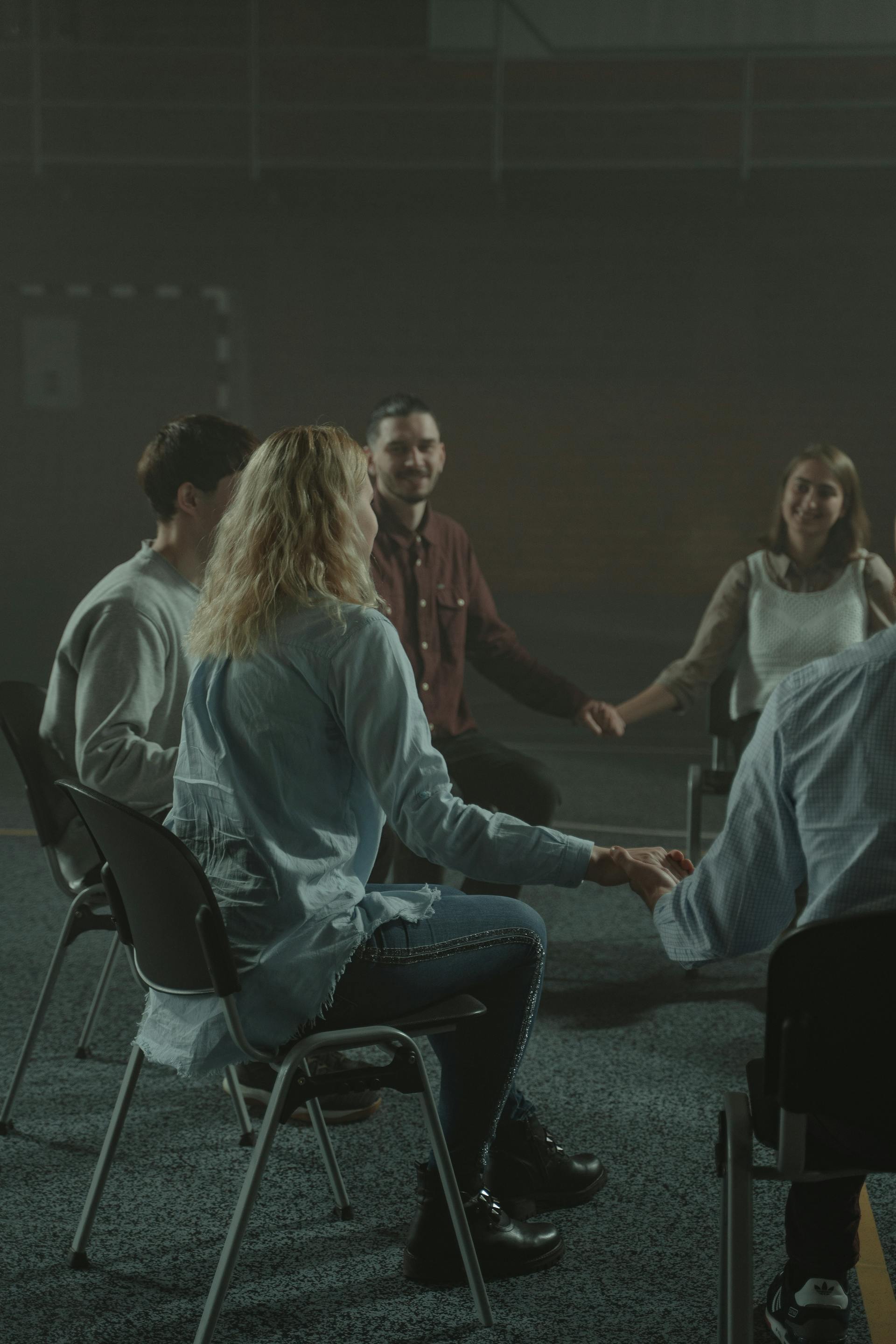 Clinical psychologist guiding small group therapy for connection-building, self-compassion, and coping skills in a supportive setting